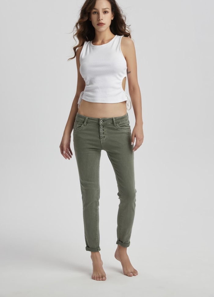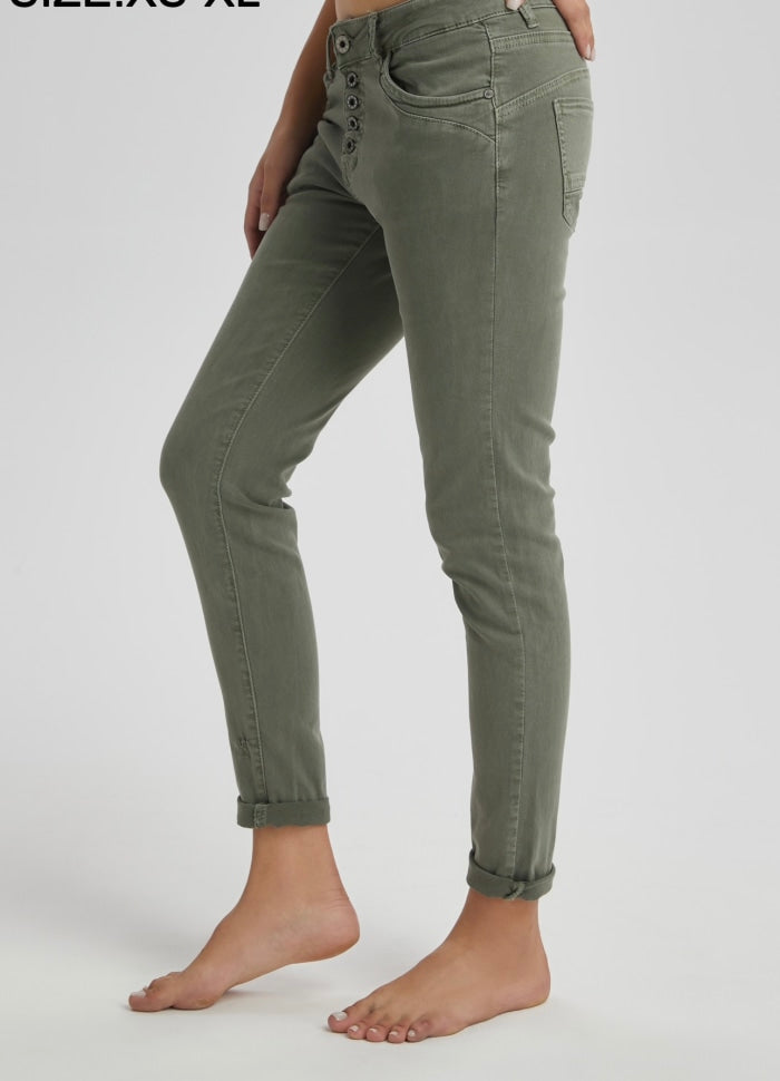 Jeans med knappelukking fra Cabana living. Disse buksene har masse strech så hvis du står mellom to størrelser, velg den minste.