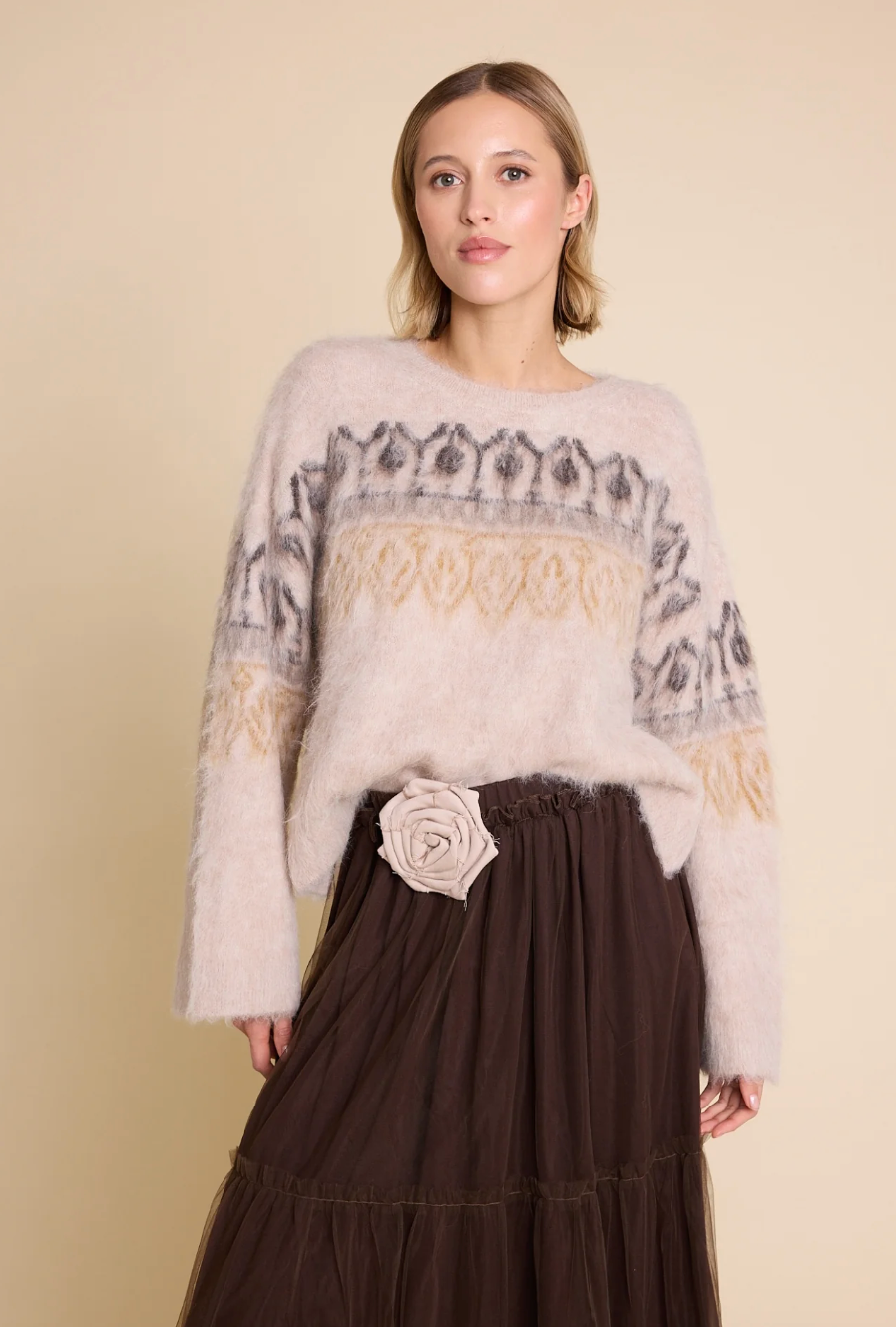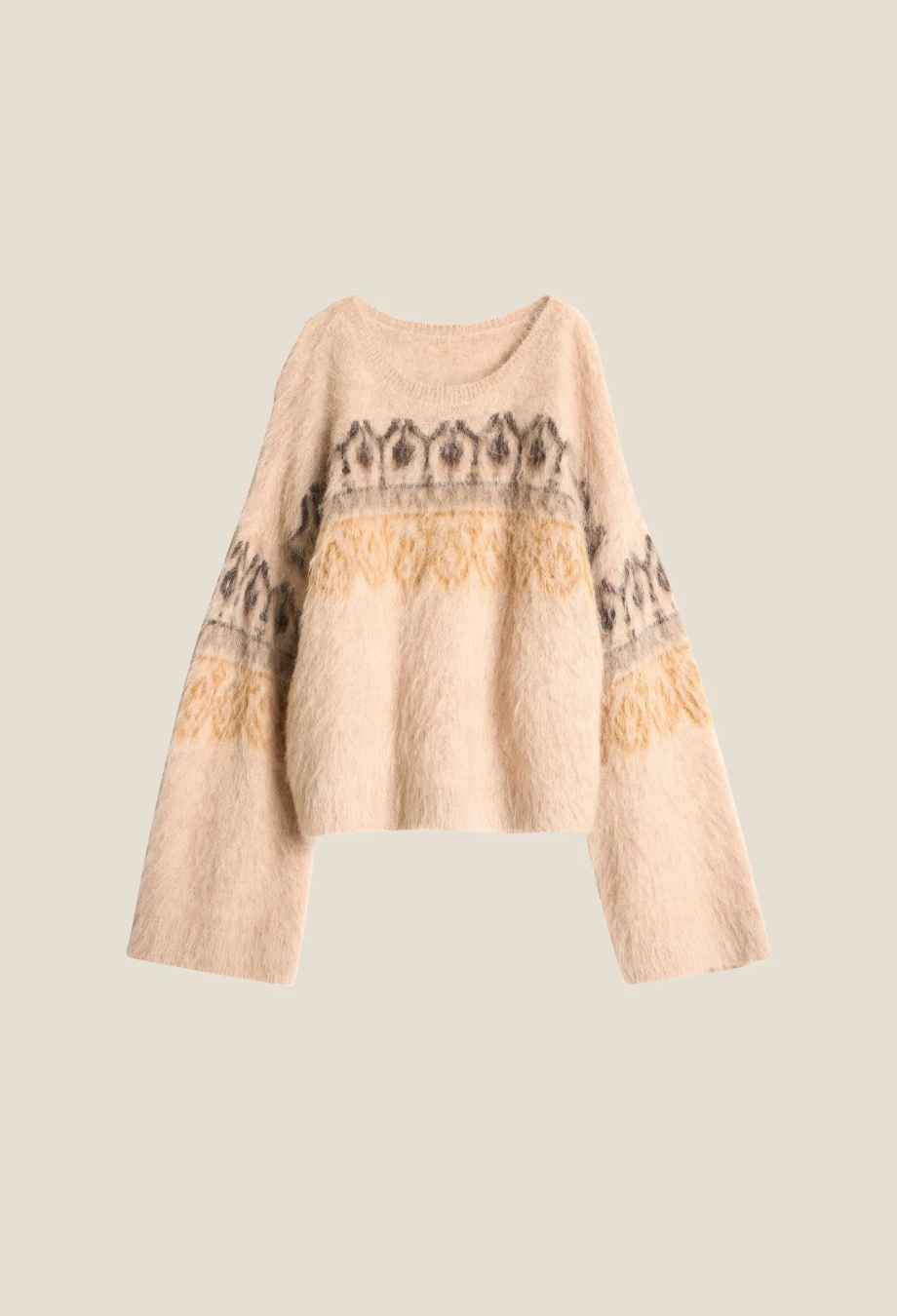 Laget av en luksuriøs blanding av alpakka- og merinoull, har den et vakkert mønster og en luftig tekstur som gir den et koselig og innbydende utseende – perfekt for kjøligere dager. Designet med en avslappet oversized passform, rund hals, vide ermer og senkede skuldre som fremhever den uanstrengte stilen.