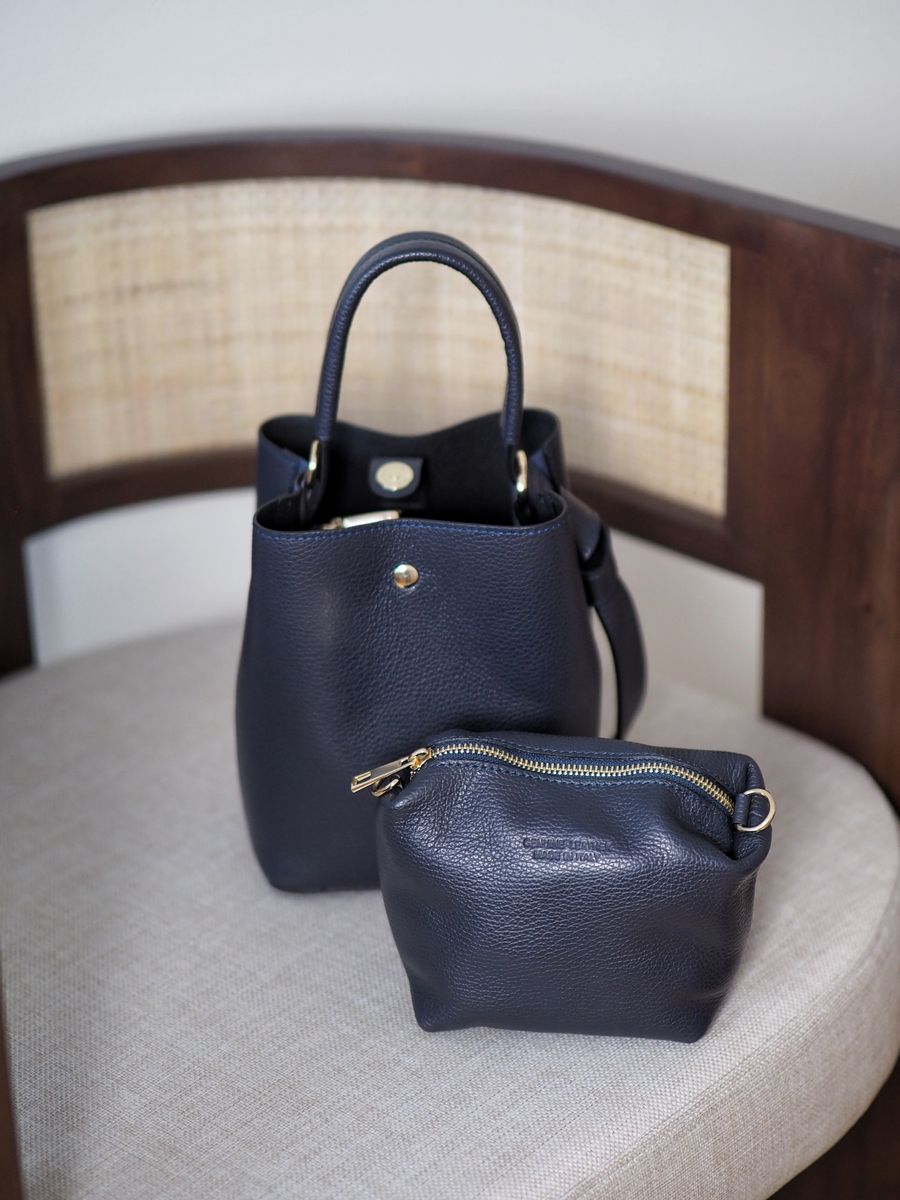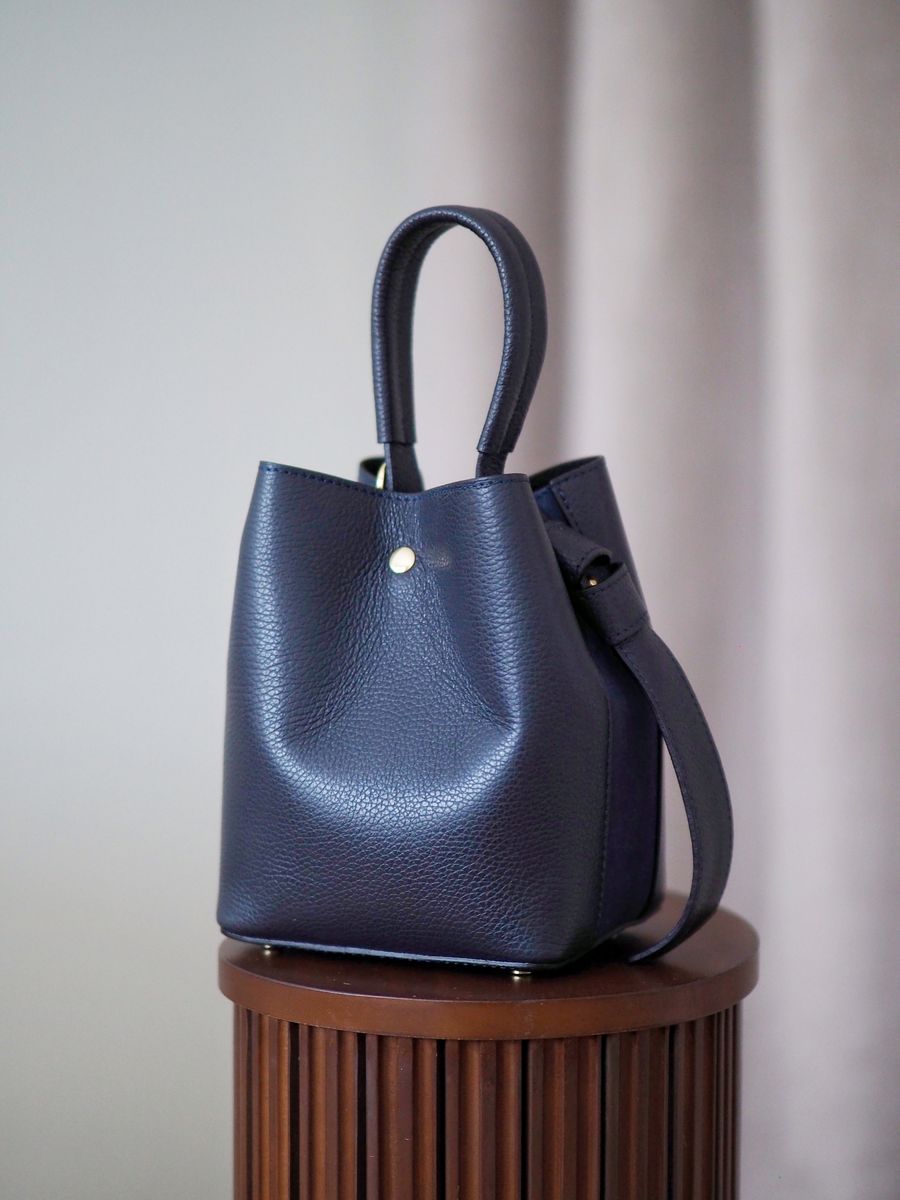 Sofistikert og elegant bøtteveske i både semsket og glatt skinn. Vesken har et dekorativt knutebelte. Vesken har to stropper, en av dem er regulerbar og lang, den andre er en håndtak.