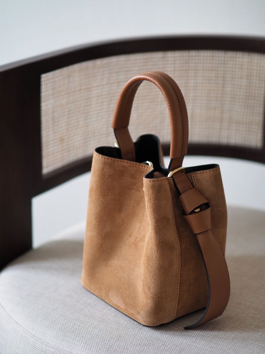 Sofistikert og elegant bøtteveske i semsket skinn. Vesken har et dekorativt knutebelte i skinn. Vesken har to stropper, en av dem er regulerbar og lang, den andre er en håndtak.