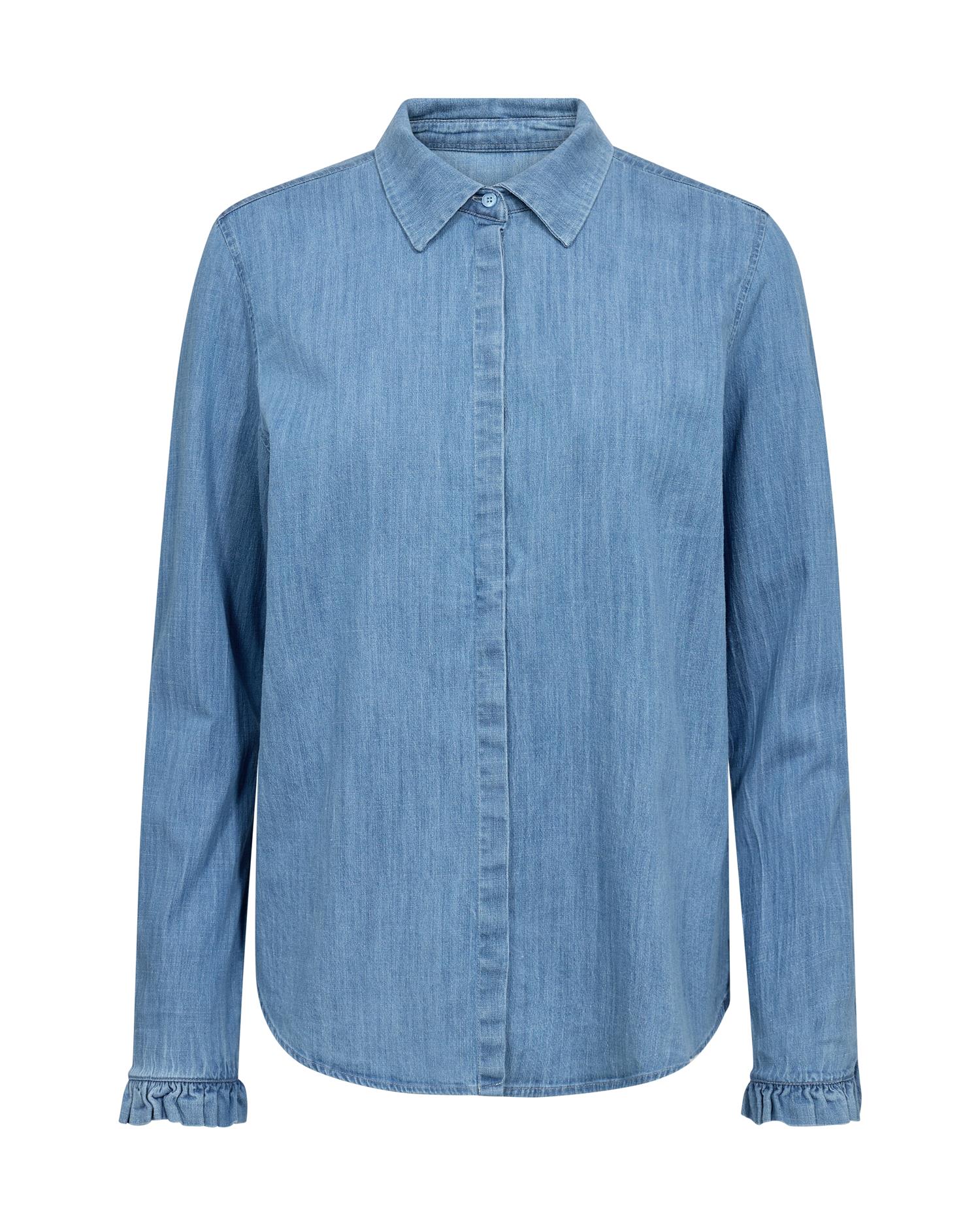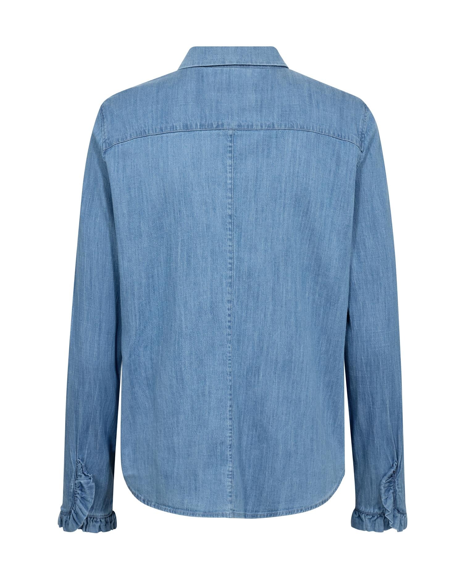 Jeansskjorte fra Mos Mosh. Liten rysje kant nederst på ermene.