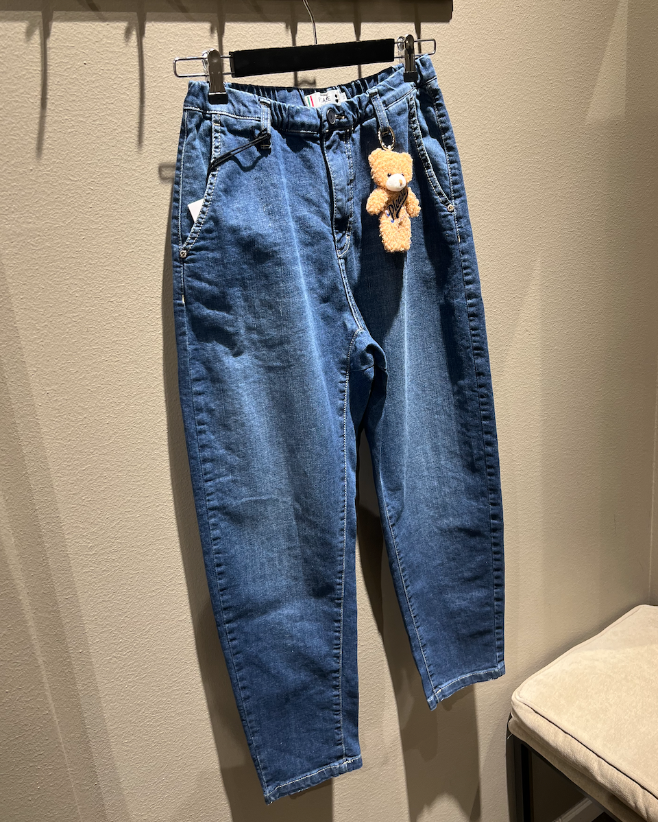 Jeans med "ballong" passform fra Please. Strikk i midjen og bamse. Bamsen kan tas av dersom man ønsker.